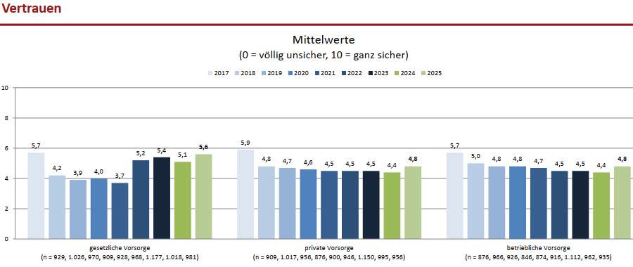 Abgefragt wurde auch das Vertrauen in die gesetzliche, die private und die betriebliche Vorsorge. Bei der Bewertung stand den Befragten eine Skala von null (schlechtester Wert) bis zehn (bester Wert) zur Verfügung.