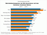 16.11.2020 (€) - Die Branche ist zwar 2019 versicherungstechnisch erneut in der Gewinnzone gelandet. Dennoch hat fast jeder zweite der 50 größten Marktteilnehmer eine Schaden-Kosten-Quote von über 100 Prozent. In der Spitze gaben sie über zehn Cent pro Beitragseuro mehr aus als sie einnahmen. Wer zu den unprofitabelsten Akteuren gehört.