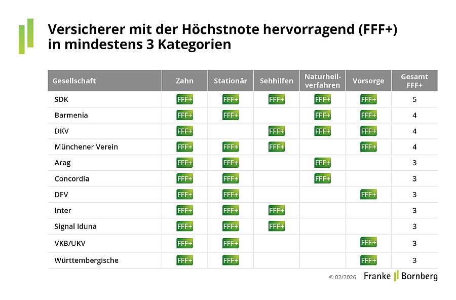 Die Bestnote für mindestens ein Produkt in drei Teilbereichen (jeweils nicht Sehhilfen und nicht Naturheilverfahren) erhielt neben den „Wiederholungstätern“ DFV Deutsche Familienversicherung AG und Versicherungskammer Bayern/UKV – Union Krankenversicherung AG neuerdings auch die Württembergische Krankenversicherung AG.