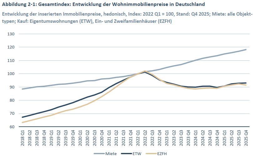 Im Jahr 2025 stiegen die Preise für Eigentumswohnungen um 3,8 Prozent, die für Ein- und Zweifamilienhäuser um 2,8 Prozent. Die Neuvertragsmieten lagen im vierten Quartal 2025 bundesweit 4,1 Prozent über dem Vorjahreswert.