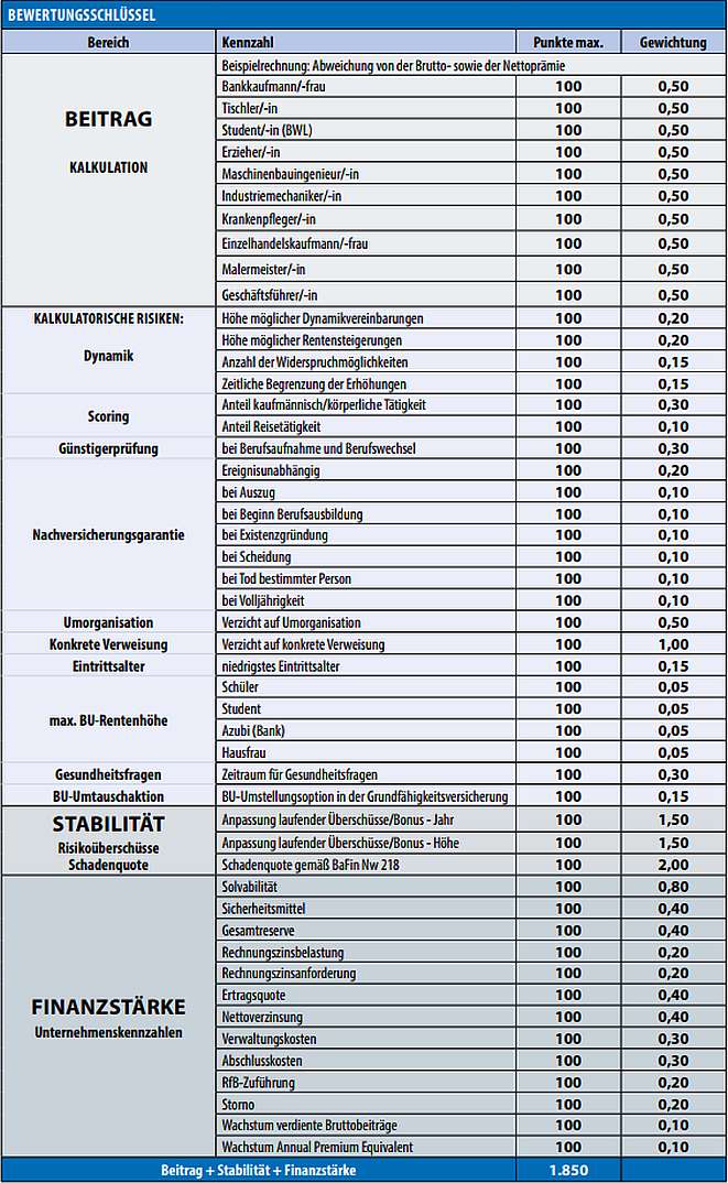 Insgesamt erhöhte sich die Zahl der – weiterhin unterschiedlich gewichteten – Bewertungsparameter von 30 auf 49. Die Kriterien sind in vier Bereiche eingeteilt. Neben den „kalkulatorischen Risiken“ (450 maximal erreichbare Punkte) sind dies weiterhin die Segmente „Beitrag“, „Stabilität“ (jeweils 500 Zähler) und „Finanzstärke“ (maximal 400 Punkte).